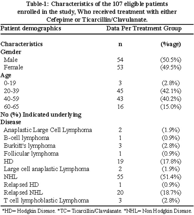The study was a prospective, open, randomized controlled trial. Included were all febrile neutropenic patients who had been treated with conventional chemotherapy for a primary, refractory or relapsed lymphoma at the department of medical oncology, Shaukat Khanum Memorial Cancer Hospital and Research centre. Eligible were patients with1 temperature of 38ºC over 4 hours apart within 24 hours or a single temperature spike of greater than 38.5ºC.2 Absolute Neutrophil Count of less than 500 or more than 500 with predicted decline to less than 500 in next 24 hours3 adult patients (age 18 to 65 years)4 patients falling in low to moderate risk category according to Infectious Disease Society of America (IDSA) guidelines. Patients who had repeated febrile neutropenic episodes during consecutive cytostatic treatment periods, could be entered more than once. Patients were excluded from the study if they had1 met initial criteria for vancomycin or getting dual therapy with or without vancomycin on day 12 severe hepatic or renal impairment (total bilirubin more than 2 or creatinine more than 2 or creatinine clearance less than 40 ml/min)3 if they had a history of allergy or other incompatibility to one of the study drugs4 patient with systolic blood pressure less than 905 with indwelling catheter or known MRSA colonization. After informed consent patients were randomly assigned to receive either cefepime (2 gram i/v Q8 hourly) or ticarcillin/clavulanate (3.2 gm i/v Q6 hourly) for empirical monotherapy in febrile neutropenia. Prior to commencement of therapy, history, physical examination, complete blood count, serum chemistry, chest X-ray, blood culture and urine analysis were done to evaluate febrile neutropenia. During a febrile episode complete blood count was done daily and serum chemistry on alternate days. Anti microbial susceptibility testing of bacterial isolates were performed by disc diffusion method. Patients were examined daily for clinical symptoms and signs of side effect.