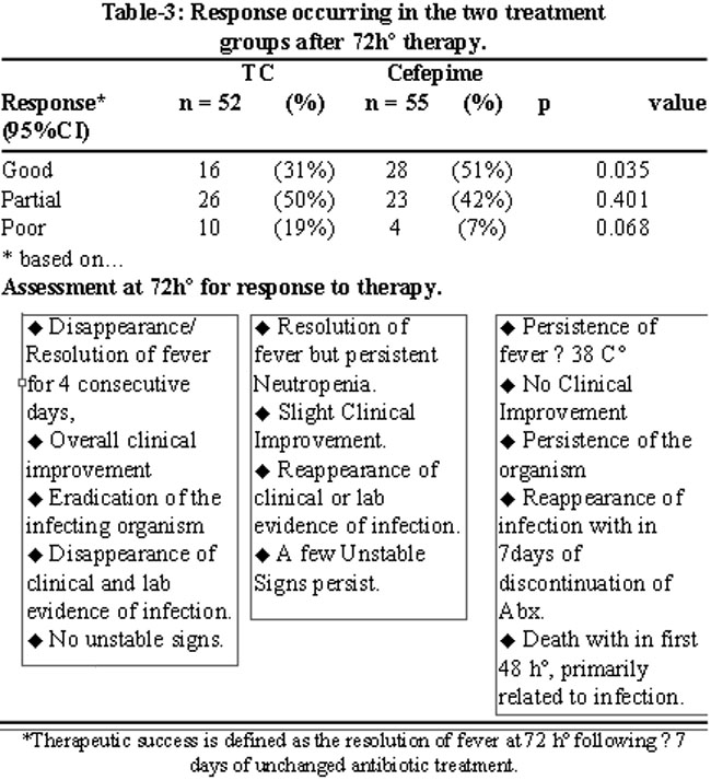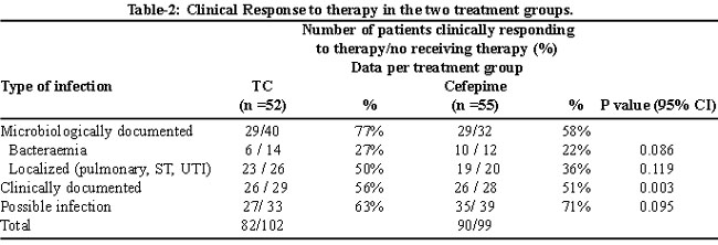 Response rate to bacteraemia in cefepime group was significantly different than the response rate of ticarcillin/clavulanate (Table-2).