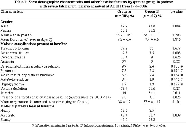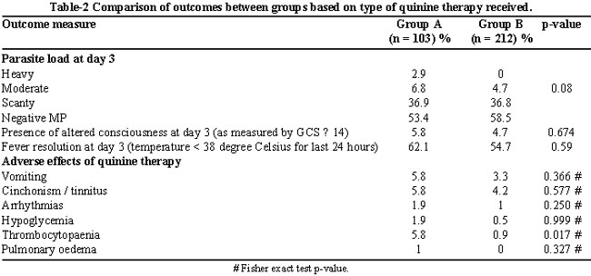 Methods: A retrospective chart review of 315 patients admitted with severe falciparum malaria and treated with quinine at a tertiary care teaching hospital of Karachi, Pakistan during 1999-2006 was conducted. Group A with 103 patients (32.7%) was given an initial loading dose of quinine while group B with 212 patients (67.3%) did not receive the loading dose. The two groups were compared in terms of reduction of parasite load, resolution of fever, recovery of consciousness and incidence of adverse effects. Outcome parameters were measured on the third day of therapy.