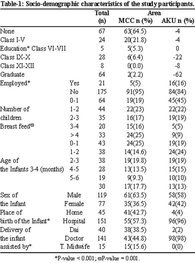 The study was conducted on mother and infant pairs who visited Mother and Child Centre (MCC), Bilal Colony (Semi urban area) and the Aga Khan University Hospital (AKU), (Urban area). Bilal Colony mainly comprises of population belonging to lower socio-economic status, while visitors to AKU belong to intermediate to higher socio-economic status. Official permission was obtained from the administration of both the centers to carry out the interviews. The participants were selected from mothers who visited the healthcare facility for well-baby follow-up and immunization of their infants. Sample of 200 was divided equally between the two centers.