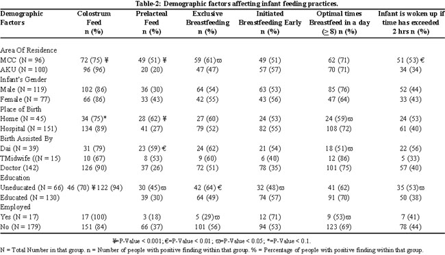 Keywords: Exclusive breastfeeding, demographic factors, prelacteal feeding, colostrums, supplemental feeding, Karachi, Pakistan (JPMA 61:99; 2011).