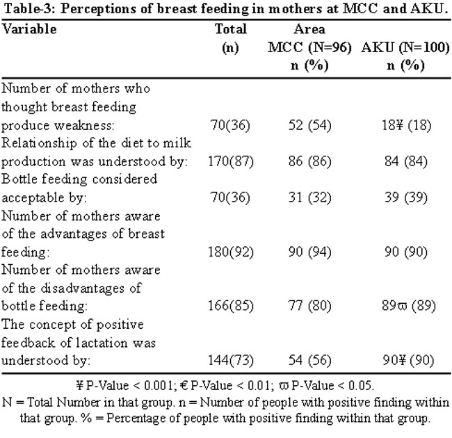 Methods: A cross-sectional study was carried out on 200 mother-infant pairs who visited the health care centers, Bilal Colony (semi-urban) and the Aga Khan University (urban), for their well baby follow-ups and vaccination using convenient sampling. Frequencies and percentages were computed and Chi-square was used to find associations between socio-demographics of mothers and their perception and practices about breastfeeding.