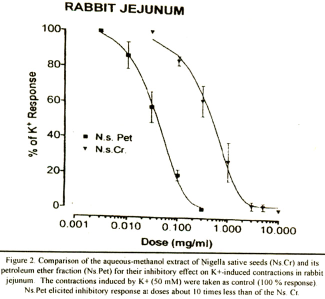 However, the plant has not been studied to provide the scientific basis for its use in asthma or diarrhoea. In this investigation, we provide evidence that the crude extract of Nigella sativa seeds contains calcium channel blocker(s), which may explain some of its traditional therapeutic uses, viz, diarrhoea, asthma and hypertension. Furthermore, activity-directed fractionation revealed that the activity reported in the crude extract might be due the presence of active principle(s) concentrated in the petroleum fraction and the further studies in collaboration of chemists are likely to yield interesting results.
