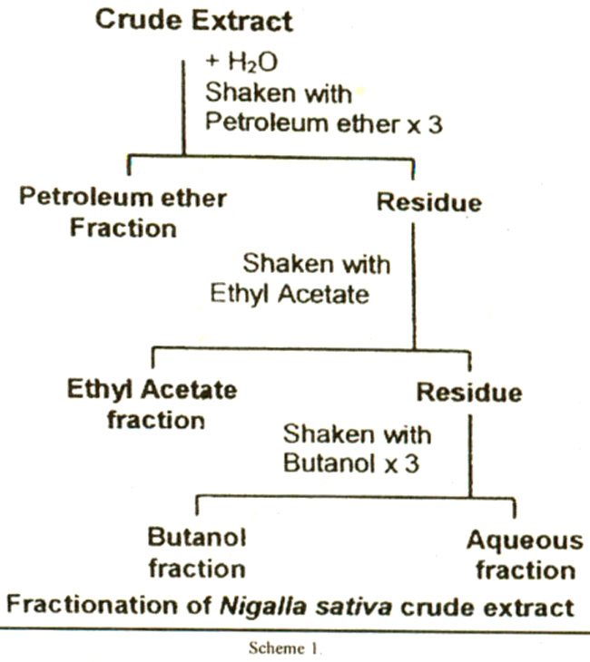 The seeds of Nigella sativa were purchased from the local market of Karachi, authenticated with the help of a botanist (Afzal Rizvi) at the Hamdard University, Karachi and the sample voucher has been submitted at the herbarium of the University. Seeds were ground to powder and soaked in 70% aqueous-methanol for three days and filtered. This procedure was repeated twice on the residue. All the filtrates were combined and concentrated under reduced pressure on a rotary evaporator below 40°C. The brownish black crude extract, yielding about 11% was coded as Ns.Cr.