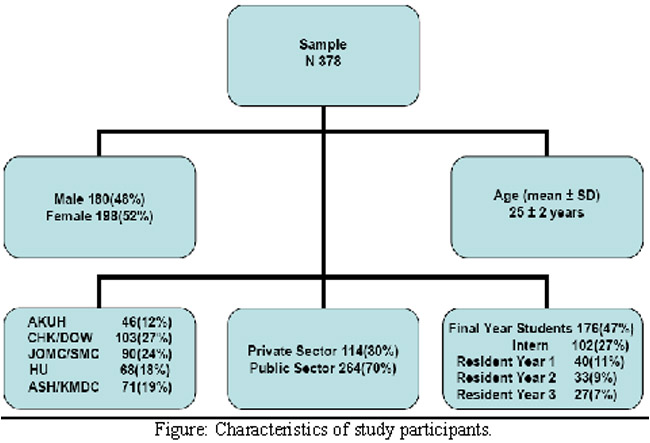 Methods: A cross-sectional, questionnaire based study was conducted in 2007-2008. Five institutes representing the private and public hospitals in the city were selected by cluster sampling. Final year medical students and fresh graduates were included. Descriptive statistics were charted using SPSS v.16 after double data entry.