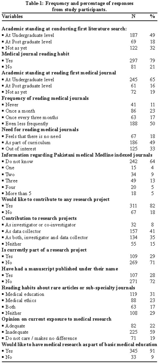 Research has a pivotal role in medical profession. The inspirations for most physicians and researchers are the unanswered medical questions and reputation, eventually improving patient care. Traditionally, medical doctors have been either pure clinicians or primarily researchers. As with other professions there is a need for multitasking for physicians as well. Emphasis has been made to integrate research within the medical community.1 Importance of having research as part of the medical curriculum is also suggested by researchers as a good source of information and learning.2 Globally speaking, within the disparity of medical curriculums both at undergraduate and graduate levels, research has been a focal point. Page et al, shed light on attitudes of developing world physicians and their perception on local and foreign journals and research.3 In Karachi, only few medical universities have adapted to this positive change. The research culture is welcomed in a handful of universities mainly influenced by their own faculty who are either true medical scientists or do research to survive in the list of vast growing medical colleges.1 Most senior physicians have had no formal research training but are masters in medical academia and clinical practice.