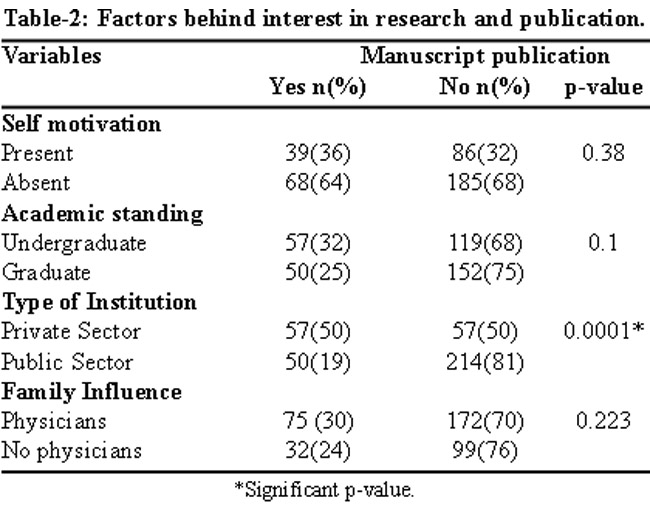 Table-2 shows the relation to research and publication influences. The data suggests that 57(32%) final year students, 20(20%) interns, 12(44%) 3rd year residents, 10(25%) first year residents and 8(24%) 2nd year residents were keen to publish. (X2 =9.196, p = 0.056) Though as the proportion of final year students were more we therefore weighted them according to their academic standing and subsequently out of a 767 total 279(29%) had already published their manuscript. Sixty (44%) of 3rd year residents published followed by 57(32%) final year students, 40(20%) interns, 32(24%) 2nd year residents and then 30(25%) first year residents. (X2 =27.926, p =0.0001) Influences from a family member were not statistically supportive though 28(32%) of the 87 participants who had multiple physicians in their family wrote comparatively more than the others.