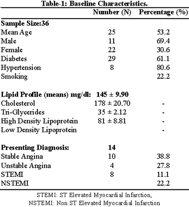 Table-1 shows the baseline clinical characteristics of the study sample. The mean age was 53.8 ± 12 years with majority (69.4%) being males. This was a high risk cohort with a significant percentage i.e. 61.1% and 80.6% being diabetic and hypertensive respectively. More than a third (44.1%) had two risk factors. Interestingly, as compared to males, 90% of the females were diabetics and 100% were hypertensive. Elevated LDL was not seen to be a problem in this cohort.