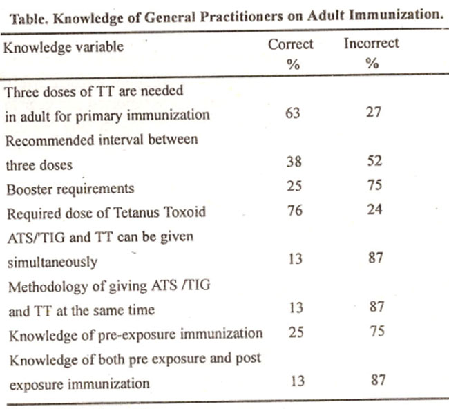 Only 25% GPs had knowledge about pre-exposure and 13% about both pre- and post-exposure tetanus immunization (table).