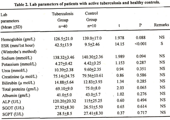 Table 2 gives the details of hematological and biochemical parameters of tuberculosis patients and control subjects. All the hematological and biochemical parameters were comparable except erythrocyte sedimentation rate (ESR) which, understandably was higher in tuberculosis patients (P<0.001).