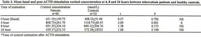The mean basal cortisol concentrations were comparable in the two groups. However, mean cortisol levels at 4 hours after stimulation with ACTH was significantly lower in patients with active tuberculosis as compared to healthy controls (P=0.001) as shown in Table 3.
