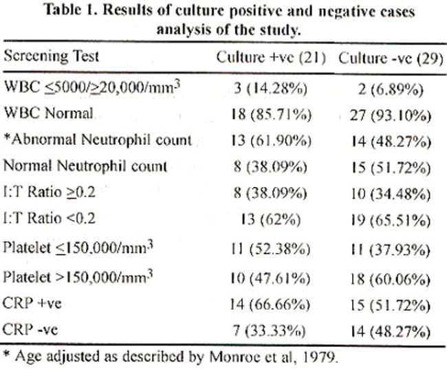 Fifty patients were evaluated for sepsis during this period. Each infant was examined by a registrar who recorded on a data acquisition sheet, predisposing perinatal factors, clinical features, and a subjective clinical impression as to the presence or absence of sepsis before investigations were instituted. Screening tests were performed along with blood culture. All 50 patients entered into the study had blood culture done. Liquid Thioglycolate liSP (OXOID) media was used for blood culture and 2 ml of blood was added to 20 ml of medium. lnoculated bottles were incubated at 36°C for 7 days and examined for growth every 24 hours. Negative reports were given after 7 days. Urine culture and C.S.F culture were done when indicated. The diagnosis of sepsis was made when there were positive findings on blood cultures. Test used for screening were (1) Total leukocyte count <5000 or >20,000/cmm, (2) Neutropenia /Neutrophilia (age adjusted count, described by Monroe et al 1979), (3) Immature to total neutrophil (l.T. ratio >0.2), (4) C-reactive protein positive (CRP), (5) platelet counts <50,000/mm.