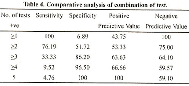 Each test used in this study had different specificity, sensitivity and positive predictive accuracy. It has demonstrated that combination of tests increases the sensitivity, specificity and positive predictive accuracy compared with a single test for the diagnosis of neonatal sepsis4-6. This was found true in our study that specificity and positive predictive value were improved with the increased number of positive tests used for screening and with all five tests positive it reached to 100 percent. Conversely with all negative tests, the likelihood of sepsis being absent was 100 percent (NPV).