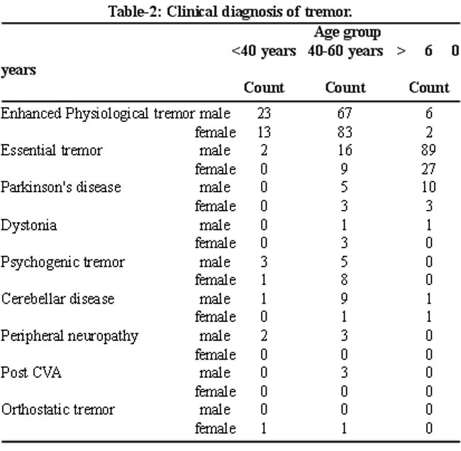 Enhanced physiological tremor was the most frequent diagnosis. Among whom, females of 40-60 years were mostly affected. None of the females had tremors due to peripheral neuropathy or post cerebro-vascular accidents. Orthostatic tremor was the rarest diagnosis among females. Essential tremors were the commonest diagnosis among males (Table-2).