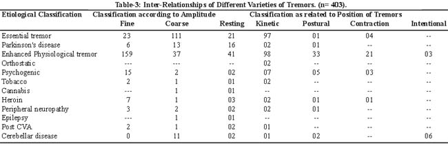 Essential tremors were mainly coarse in amplitude, whereas commonest fine tremors were diagnosed as Enhanced Physiological tremor. Classification as related to position of tremors: resting, kinetic and postural were the main finding, whereas intentional tremor was the rarest finding (Table-3).