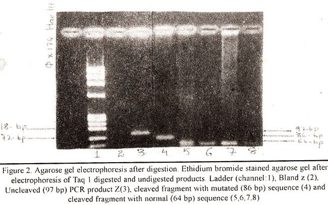 One of the daughters also had a normal variant and normal concentration of alpha-I-AT whereas the son and the other daughter and low levels of alpha I AT. This daughter also exhibited a pattern on IEF that appeared indistinct. The son demonstrated a pattern on LEF which was very similar to that of the proband and clearly exhibited a pattern of ZZ type. To confirm the IEF results, particularly in one of the siblings and daughter with low alpha 1 AT, molecular techniques were applied which not only provides early identification but also distinguishes heterozygous and homozygous alpha-i antitrypsin deficient13. The results of the typing for the Z mutation more clearly established the presence of Z mutation in the proband and her son. The relatively unresolved phenotyping carried out by IEF of one sibling and a daughter who had low alpha-I AT levels with indistinct patterns showed that the daughter and the sibling both had MM phenotypes. as judged by PCR and subsequent restriction digestion. Thus normal persons and those homozygous for the Z mutation were distinguished unambiguously by applying PCR based method. All the subjects with normal MM phenotype believed to have the normal sequence as their amplified product by PCR and subsequent digestion with restriction enzyme Taq I produced a DNA fragment of 64 base pair, that is only observed in the absence of a mutation. While the proband and her son’s DNA treated in the same way manifested Z mutation by showing a final product at the 86 base pair position as analyzed on agarose gel (Figure 2).