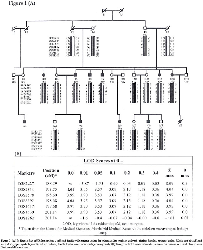 Known loci for autosomal recessive WH were first examined by linkage analysis using locus specific microsatellite markers. Linkage was obtained for markers located on chromosome 3q27.3. Haplotypes for these markers are shown in Figure-1A. Several markers were found to be homozygous in all the patients. Two-point LOD scores between the disease phenotype and markers in this region are summarized in Figure-1B. The maximum LOD score of 4.04 was obtained for the markers D3S2314 and D3S3592 with no crossover. Proximal and distal crossovers were obtained with markers D3S2427 and D3S1262 in individual III:7 and III:5 respectively.