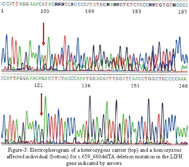 Chromosome 3q27.3 is a locus for LIPH gene. Mutation screening of the candidate gene, LIPH, revealed a homozygous 2-bp deletion (TAdel) mutation in exon 5 in all the affected individuals (Figure-3).