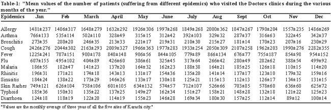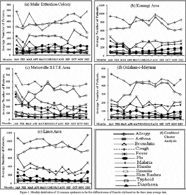 Results: The severity of different epidemics varied among months and localities. The effective diseases potential areas with decreasing order were: Lines Area, Korangi, Malir, Metroville and Maymar. In all these areas cough, allergy, asthma, flu, fever and skin rashes were the widely distributed epidemics while the prevalence of other six epidemics prevailed to a lesser extent. Lines Area/Korangi and Malir/ Metroville differed considerably with respect to prevalence of epidemics (P<0.05) into a lesser, while Gulshan-e-Maymar was significantly different (P<0.001) from the other four areas. Among four distinct groups i.e. 1) allergy/cough, 2) asthma/flu, 3) fever/skin rashes, 4) bronchitis, malaria, typhoid, diarrhoea, rhinitis and sinusitis, the first three groups were widely distributed.