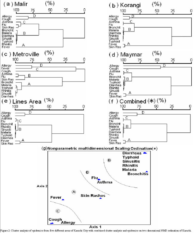 Methods: This ecological study was conducted from 2006 to 2009. Data was obtained from five different localities of Karachi. In each area, physician clinics were selected and questionnaire forms filled by professionals at the clinics, regarding health problems of patients. Multivariate analyses were used to summarize the data, for comparison and grouping the spread of epidemics.