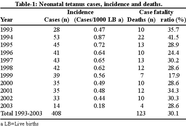 Conclusions: The rate of decline of neonatal tetanus incidence and case fatality was consistent with the impact of routine and supplementary immunization activities. In addition to strengthening maternal tetanus toxoid immunization coverage and hygienic delivery practices, health education focusing on increasing awareness of NT could help reduce NT mortality.