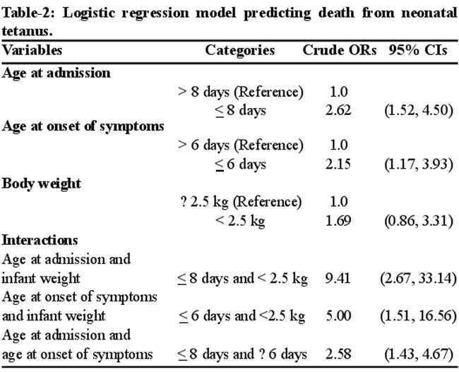 The results of the univariate analysis of risk factors showed that although there was proportionally increased mortality associated with lack of maternal immunization and antenatal care, delivery at home, delivery assistance by untrained TBAs, poor cord care, there was no significant difference in mortality between survivors and deceased (Data not shown).