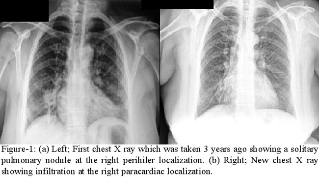 A 50 year old female patient was admitted with a 3 month history of haemoptysis. Physical examination, full blood count and biochemical analysis were normal. She had a 20 packet/year smoking history. In her medical record, she had a past history of pneumonia which was 3 years ago and at that time a 2.2 cm solitary pulmonary nodule located at the right perihilar location was detected in her chest X ray but patient did not accept any further intervention and remained asymptomatic upto date (Figure-1a).