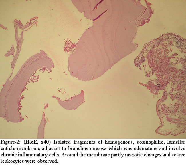 The symptoms of our patient were in accordance with hydatid disease but she did not have a typical radiological picture. Patient accepted a bronchoscopic evaluation because her haemoptysis continued. Fiberoptic bronchoscopy detected a vegetative whitish membranous material in the medial segment of right middle lobe and surrounding mucosa was normal. Pathological examination of the bronchoscopic biopsy material revealed diagnosis of hydatid cyst with cuticles (Figure-2).