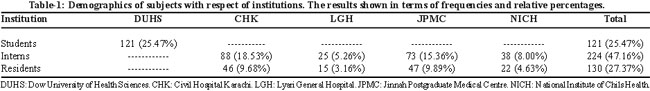 Of those who returned the questionnaire, 475 were considered for analysis; Few participants, (5%) refused to participate. Among the responding participants 135 (28.4%) were from Civil Hospital; 72 (15.2%) were from Dow Medical College; 40 (8.4%) from Lyari General Hospital; 120 (25.3%) from Jinnah Post Graduate Medical Centre; 60 (12.6%) from National Institute of Child Health, and 48 (10.1%) were from Sind Medical College. The distribution of the participants according to their academic level that is final year students, interns or residents is shown in Table-1.