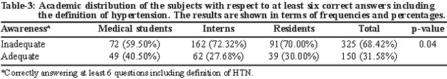 Only 150 (31.58%) of the participants demonstrated adequate level of awareness about hypertension. Further distribution according to the academic level showed that medical students have better knowledge regarding hypertension. Chi Square test was applied on the designation (Chi square =6.18, p= 0.04) (Table-3).
