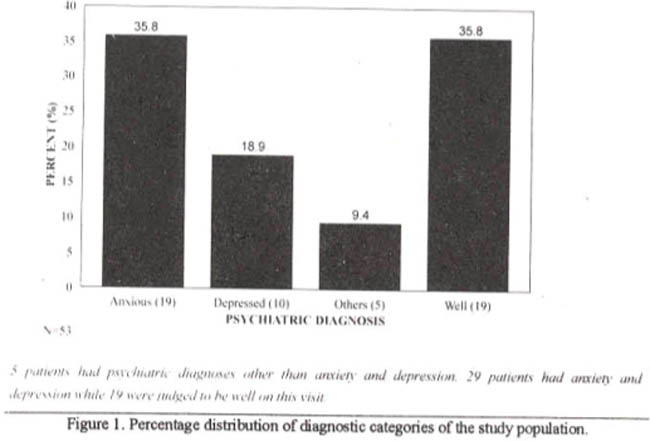 In step III of the study, 61 patients presented to the psychiatry clinics of AKUH. Eight (13.1%) did not fill in the questionnaire: 4 were in psychotherapy, 2 were grossly agitated and one each did not meet our age or language eligibility criteria, the remaining 53 patients were included in the study.