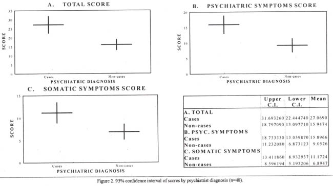 Figure 2 gives the total scores with 95% confidence intervals for cases and non-cases. It separately indicates the scores for psychiatric and somatic stems as well. An analysis of all scores obtained showed that the best trade offbetween specificity and sensitivity was found at a score of 20 i.e., a sensitivity of 66%, a specificty of 79%, a PPV of 83% and a NPV of 60%.