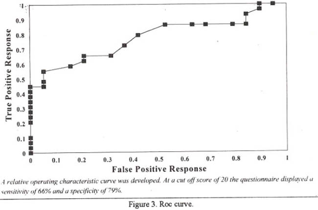 Figure 3 shows the roc curve that complements the above analysis displaying that at a cut off score of 20 the questionnaire has a sensitivity of 66% and a specificity of 79%.