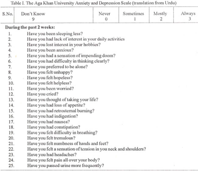 In the second step, this close-ended questionnaire was pilot tested on 50 randomly selected adult volunteers in CHC to determine its language comprehension, cultural acceptance, reliability and administrative difficulties. It was verbally administered by (BSA). Item-item correlation16 of responses obtained was carried out and items which had a correlation coefficient of 0.75 or more (measuring that these stems were likely to be measuring the same attribute 75% or more times) were reviewed by two psychiatrists (HR and MMK) and based on their best clinical judgement items with similar content and patient responses as indicated by their high correlation coefficients were dropped and the final questionnaire prepared. This final questionnaire (Table I) was named the Aga Khan University Anxiety and Depression Scale (AKUADS).