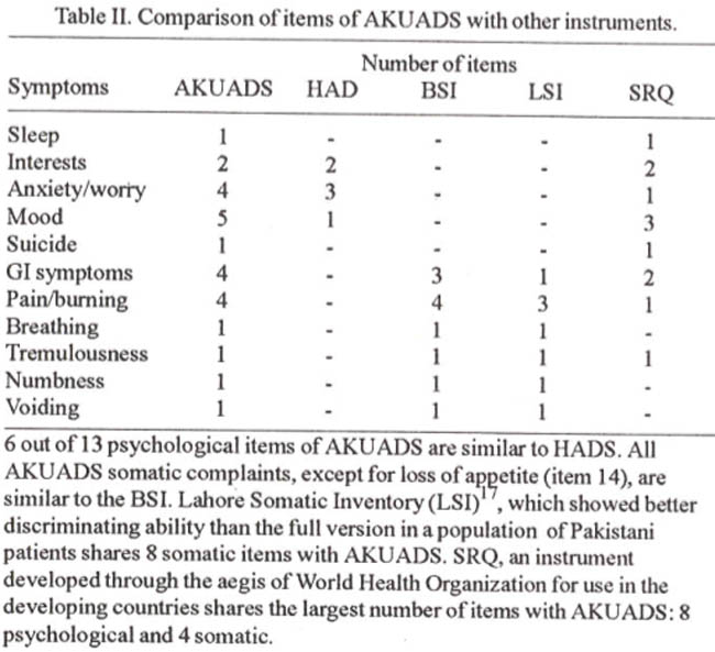 AKUADS items cover most of the clinical features considered characteristic of anxiety and depressive disorders in the existing classification system: sleep, appetite, mood, interests, concentration, anxiety, loneliness, hopelessness, suicidal ideation, gastro-intestinal symptoms, breathing difficulties, etc. It makes notable comparisons with the Urdu translation of Western instruments (Table I).