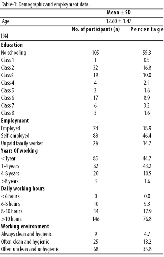 The ages of the child labourers in the study ranged from 9 to 14 years with a mean age of 12.60±1.47 years. Children were employed in different occupations, which included 37 (19.5%) mechanics; 40 (21.1%) street sellers; 14 (7.4%) garbage collectors; domestic servants 2 (1.1%); in shops 17 (8.9%); in small cafeterias 23 (12.1%); carpenters 21 (11.1%); car cleaners 16 (8.3%); welders 3 (1.6%); electricians 6 (3.2%); cobblers 9 (4.7%); peons 1 (0.5%) and compounders 1 (0.5%). Of the total, 105 (55.3%) had never gone to school; 74 (38.9%) were employed; 88 (46.4%) were self-employed; and 28 (14.7%) were unpaid workers. The daily working hours of 146 (76.8%) of those interviewed were over 10 hours. Only 9 (4.7%) child labourers said their working environment was always clean and hygienic (Table-1).