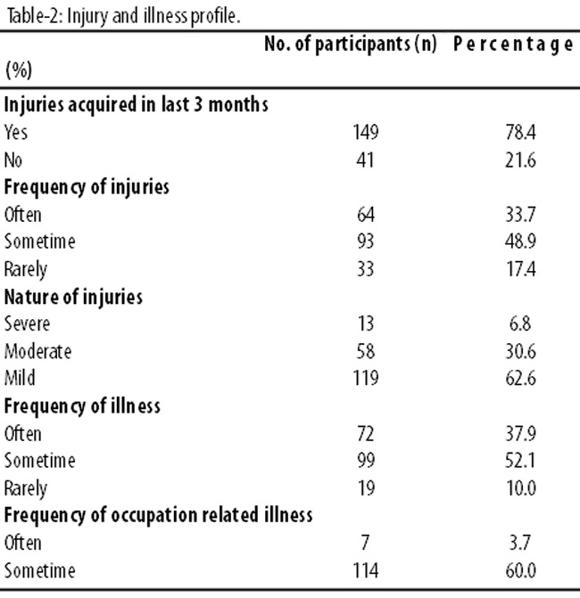 When questioned about occurrence of any injury or injuries during the preceding 3 months, 149 (78.4%) remarked that they did get injured; 64 (33.7%) \\\'often\\\' suffered injuries at work; while 93 (48.9%) said they \\\'sometimes\\\' experienced injury (Table-2).