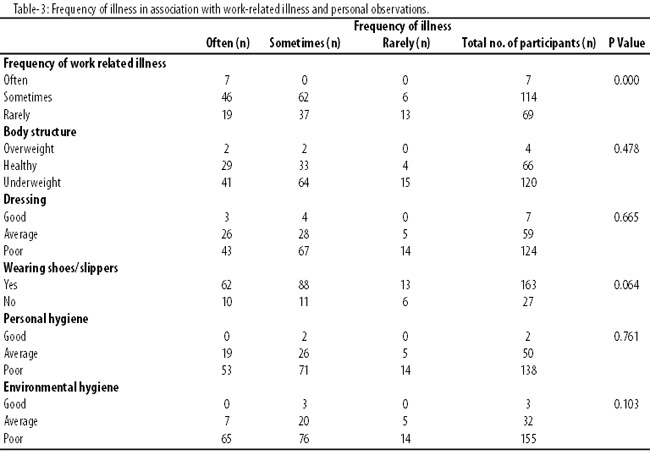 The association between environmental hygiene observed and the frequency of work-related illness was statistically significant (p= 0.001).