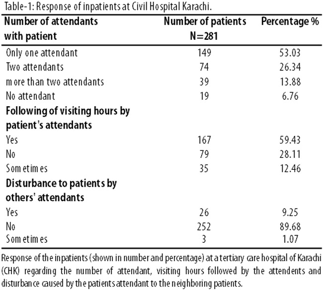 As shown in Table-1, the majority of the patients, more than 50% had only one attendant staying with them in the ward itself. Very few of the patients were alone in the ward without an attendant (7%). Regarding the visiting hours only about 60% adhered to the timing schedule of the Civil Hospital Karachi. Remaining either did not follow the rules or occassionaly adhered to the visitors timing for the CHK. Surprisingly around 90% were not disturbed by the visitors of their neighboring patients or the visitors of the other patients in the same ward.
