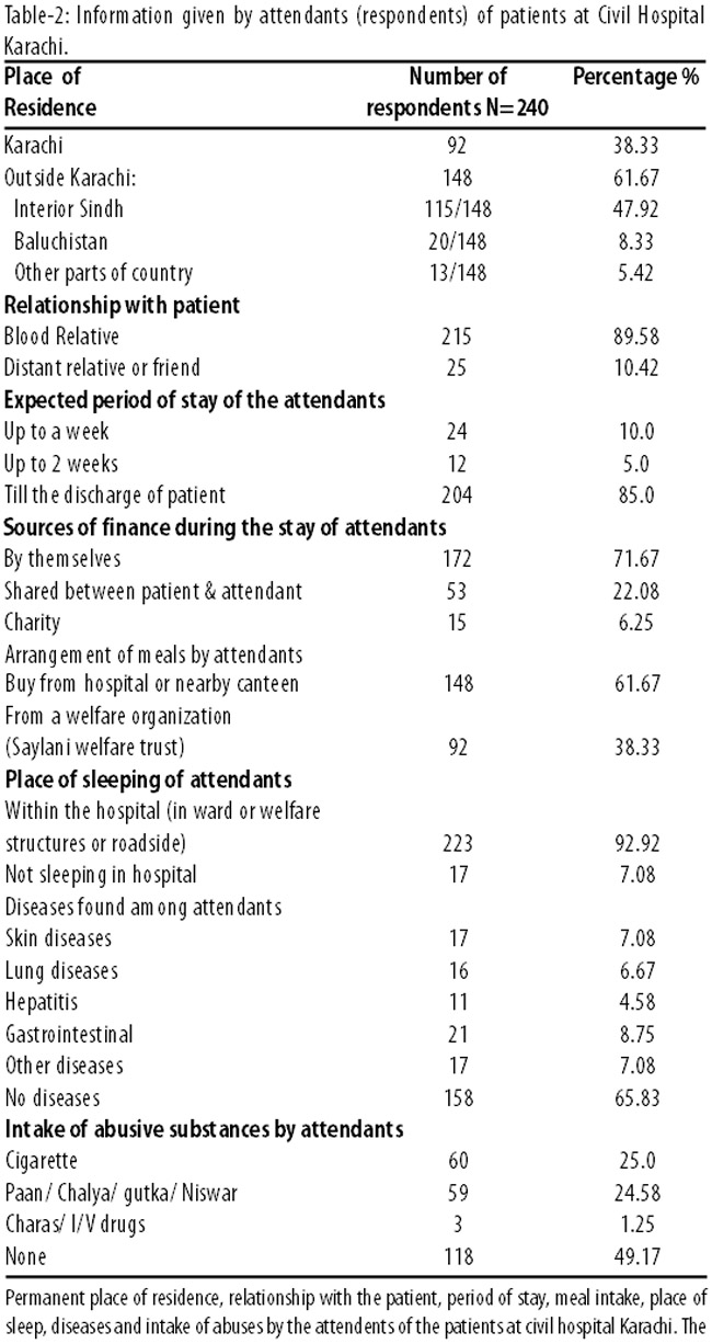 Table-2 shows the results for the responses of attendants with the patients admitted in CHK. As shown in the table, few attendants were from Karachi itself, majority being from outside Karachi i.e cities or villages in other parts of the sindh province of Pakistan. Only 8% of the attendants were from Baluchistan. Regarding the relationship of the attendant with the patient, this is shown in Table-2, and considering the culture in our part of the world, it is not surprising that nearly 90% were blood relatives. Table-2 also shows the duration of stay of the attendants with the patient, at CHK. Most of them were with the patient till he or she was discharged from the hospital and they supported all expenditures, such as food etc for themselves. The Saylani Welfare Trust (a local Nongovernmental organization, NGO) was supportive to the patient attendants, as it provided food to less than 50% of the total attendants of the patient. However, there was no help from government or NGO regarding shelter for the attendants, mostly from outside Karachi. Therefore they slept under the open sky, either within CHK or road side outside CHK; this was very disturbing to most of them. The attendants were afflicted with a number of diseases and were taking abusive substances; these have been described in detail in Table-2.