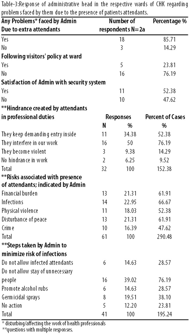 Table-3 shows the responses of Administrative heads (HODs or their representatives) of CHK. This table shows that the HOD faced problems with the extra attendants, as according to them the attendants and the patients did not follow the visitors policy rules at CHK.