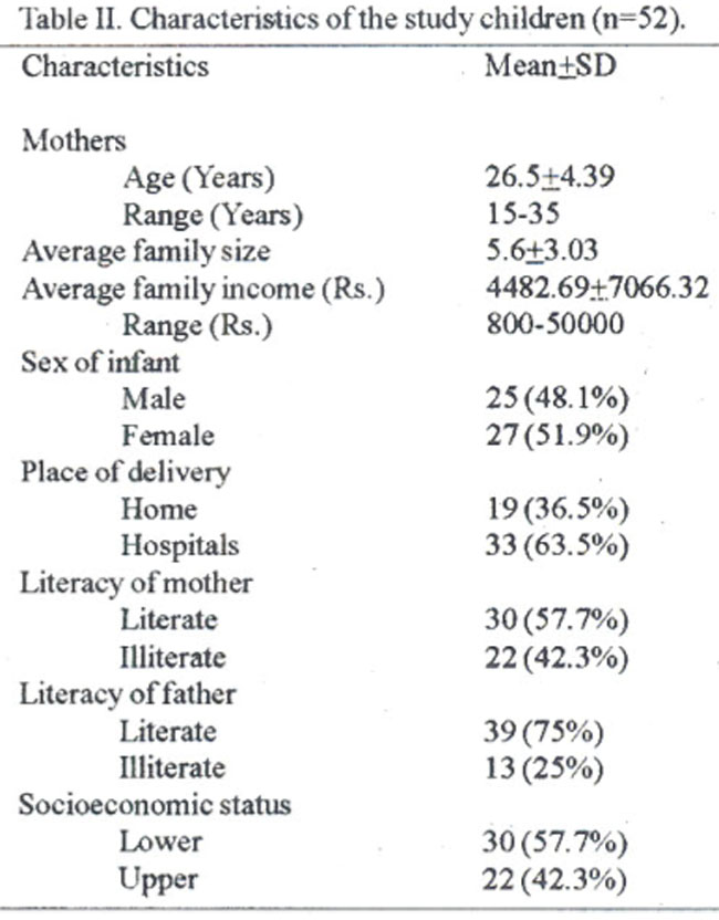Education although included in the assessment of socioeconomic status was also categorized separately, as literate mothers even if in low socioeconomic group behaved differently. All children born to those women between January, 1993 to April, 1993 were registered and followed-up each month during their first year of life. An Interviewer who had Master’s Degree in the subject of Education (non-medical) was recruited and trained to follow-up the registered infants at their homes. The first visit was made within one week of birth. Babies born through caesarean section at hospitals, were visited them by the Principal Investigator, as in these cases mothers had to stay at hospitals for a week after the birth of their children. In this way we got a chance to observe the infant feeding routines of four hospitals. These hospitals were not located in the study area, three of them were teaching hospitals and fourth was a private setup. During the visit to those hospitals, doctors and nurses taking care of mothers and their infants were also interviewed to know their routines for infant feeding. At each follow-up visit, information on beliefs about infant feeding was obtained and the type of food that the infant received was recorded. Infants were weighed at each visit and their health condition noted.
