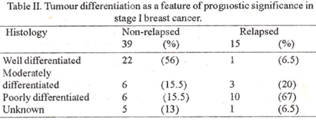 The increased risk of breast cancer in patients with a positive family history of breast cancer is well recognised8-12. This was also observed in this study where 6 recurrences occurred in patients with a family history of breast cancer compared to 2 inthe non-relapsed group. Several investigators have demonstrated increasing 5 year survival rates with increasing well differentiated tumour nuclei5,6,9. Fisher et al reviewed the pathologic features of invasive carcinoma of breast and found significant association between short term \\\'recurrences (2 years) and anaplastic tumour nuclei2,5. This was observed in our study also. The associationbetween rapid tumour growth and necrosis is well recognised and indicates a tumour of high malignant potential2,3,5,9. . Our results support this finding. Similarly tumour lymphatic and vascular invasion are also poor prognostic features2,3,5,9. We noted a high early recurrence rate in such patients. Although the number of patients studied is small to draw a meaningful conclusion, we could conclude that all patients presenting with stage I breast cancer should be evaluated according to histopathological risk factors and after surgery; those with poor prognostic factors should receive adjuvant chemotherapy irrespective of age and menopausal status3,4,6,7,11.