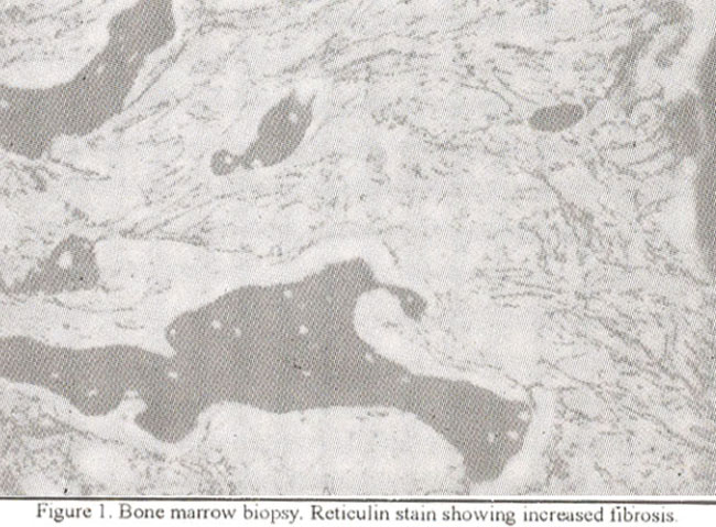 A 28 year old thin build man presented with generalized Weakness, weight loss and progressively increasing pallor since one and a half years. Two weeks before attending the medicine clinic, he developed low grade fever and also noticed a nodular swelling on left side of the neck, On exatnination, lie was found to have severe anaemia, hepatosplenomegaly and enlarged scalene lymph node on left side of the neck. Laboratoiy work up revealed Hb 3.0 gm/dl, a leukoeiythroblastic picture with many teal’ drop shaped red cells. The bone marrow aspiration was difficult and yielded a dry lap. Subsequent bone trephine biopsy revealed a cellular marrow with large number of mature and immature megakaryocytes and markedly increased marrow fibrosis which was confirmed by reticulin stain (Figure 1).