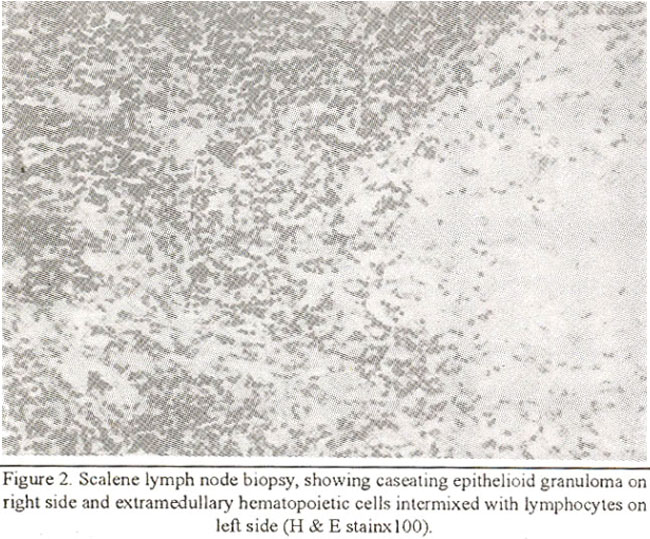 Fine needle aspiration of scalene lymph node was carried out which showed few atypical cells with hyperchromatic nuclei and epithelioid cells in a lympho cytic background. The possibility of Hodgkin’s disease was questioned with recommendation of histological evaluation. The excisional biopsy of lymh node revealed extrarnedullary hernatopoicsis and caseating granulomas compatible with tuberculosis (Figure 2).