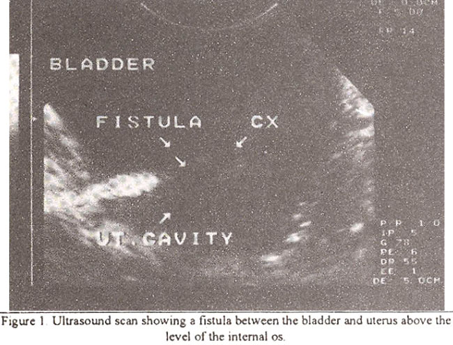 A 28 year old pam 3+0 presented with painless haematuria lasting 5 days for the last 3 months. The last delivery was 8 months earlier, her third Caesarean section with tubal ligation. There was no other urinar complaint. She was amenorrhoeic since delivery. Physical examination, laboratory investigations and intravenous pyelogram (IVP) were unremarkable. Ultrasound examination showed a communication between the bladder and uterus just above the cervix (Figure 1).