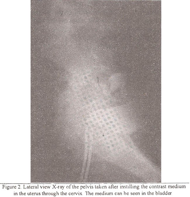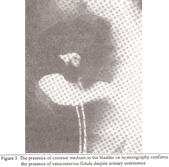 A 22 year old para 2+0 had delivered by second Caesarean section 9 months back. For the last 3 months she had frank painless haernaturia lasting 4 to 5 days every month and was amenorrhoic since Caesarean section. The physical examination, laboratory investigations and IVP were normal. Cystoscopy showed a 1 cm vesicouterine fistula 1.5 cm above the trigone and hysterography demonstrated spill of contrast medium into the bladder (Figure 2).