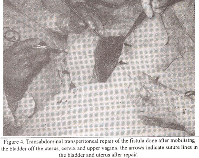 A 26 year old para 2+0 had second Caesarean section 20 months. earlier. She remained amenorrhoeic after stopping breast feeding but had frank painless haematuria every month lasting 3 to 4 days. The examination and IVP were uninformative. Ultrasound cystoscopy and hysterography confirmed the fistula between the bladder base and uterus above the cervix. Examination under anaesthesia after instilling 150 ml of dye showed no abnormality, but on putting another 300 ml of dye into the bladder, the same was seen escaping through the cervix7. A transperitoneal abdominal repair of the bladder and uterus after adequate mobilisation was carried out in two layers (Figure 4).
