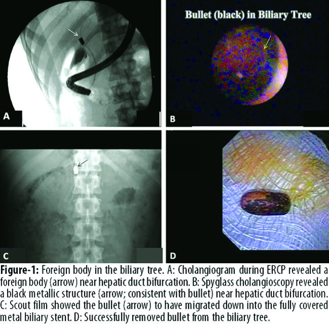 A 30-year-old gentleman with a history of abdominal gunshot wound about 5 years ago was admitted with recurrent abdominal pain and elevated liver enzymes. During endoscopic retrograde cholangiopancreatography (ERCP), a foreign body was noted near the hepatic duct bifurcation with upstream dilation of the intra-hepatic biliary tree. The foreign body appeared to move after balloon dilation. However, the exact location could not be determined. A subsequent computed tomography (CT) scan of the abdomen was also not helpful due to metallic artefacts. SpyGlass cholangioscopy was then performed. It revealed fibrous stricture in mid-common bile duct (CBD) and a black metallic object consistent with a bullet inside the bile duct near hepatic duct bifurcation (Figure 1).