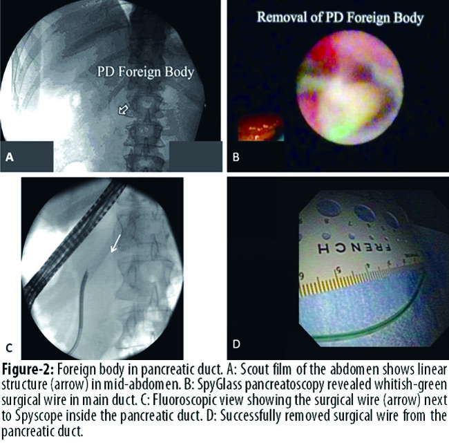 Intraductal foreign bodies in the pancreatography bile and pancreatic ducts pose a special problem. Routine abdominal imaging, including endoscopic retrograde cholangiopancreatography (ERCP) is very helpful, but is relatively limited by the inability to directly visualise the foreign bodies. Peroral cholangiopancreatoscopy can be helpful in such cases. Here we present two cases where intraductal foreign bodies were successfully removed using the advantage of direct visualisation from SpyGlass cholangiopancreatoscopy system.